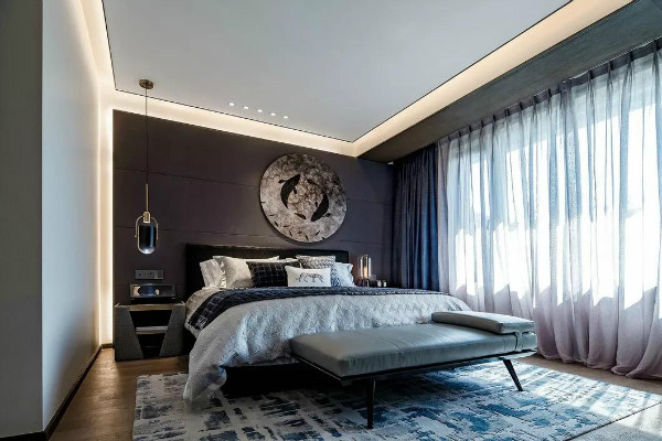 卧室空间重黑而抑阳,意在让空间能尽快让人进入休息状态。蒙自锦隆财富中心天花和墙角装上暖色灯带,构建空间立体感。深黑色的床头墙挂上极简抽象的阴阳鱼装饰,床头柜上方拉下一盏复古吊灯,灰色编织床铺柔软温和,设计上一张皮艺床尾凳,让日常更加方便整理。轻奢风的床头柜和梳妆台,让艺术与生活结合,达到现实与理想的巧妙平衡。